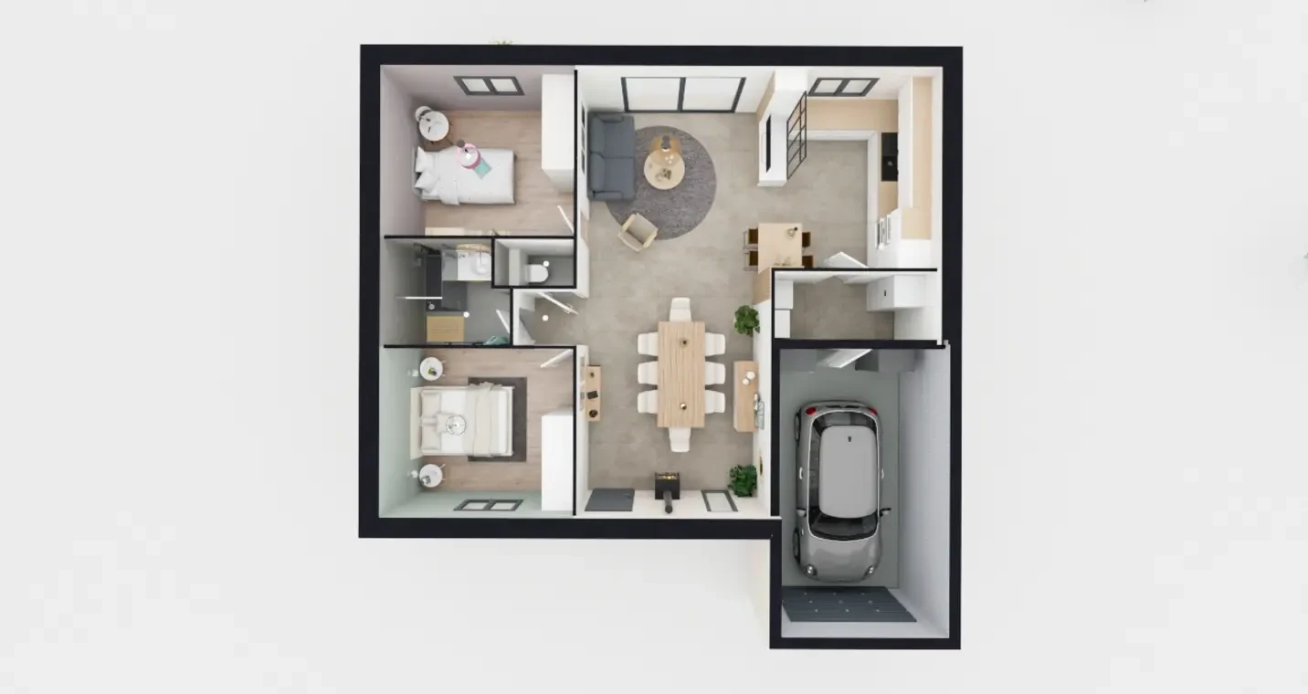 Cette maison de plain-pied, pensée pour allier praticité et bien-être, développe 72 m² parfaitement optimisés, complétés par un garage harmonieusement intégré au bâti.