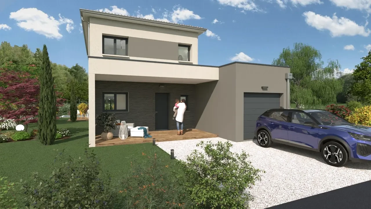Avec ses lignes cubiques et son toit plat, cette maison contemporaine de 111 m² sur deux niveaux affirme un style moderne et raffiné. L’avancée du garage renforce son identité architecturale et apporte une dynamique élégante à la façade.