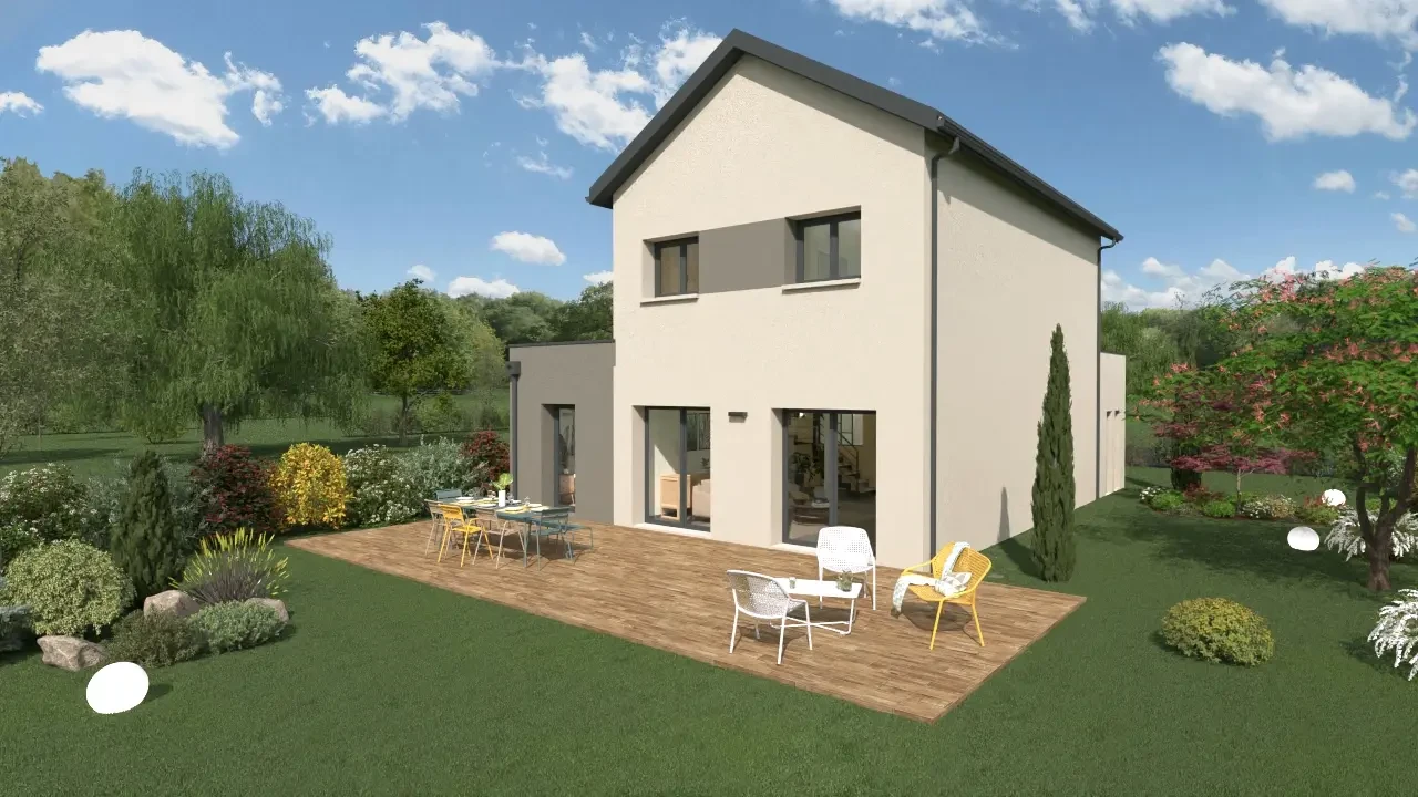 Résolument moderne, cette maison de 111 m² sur 2 niveaux séduit par ses lignes cubiques et son toit plat, qui lui confèrent un style unique et élégant. L'avancée du garage accentue son allure contemporaine et donne du caractère à la façade.