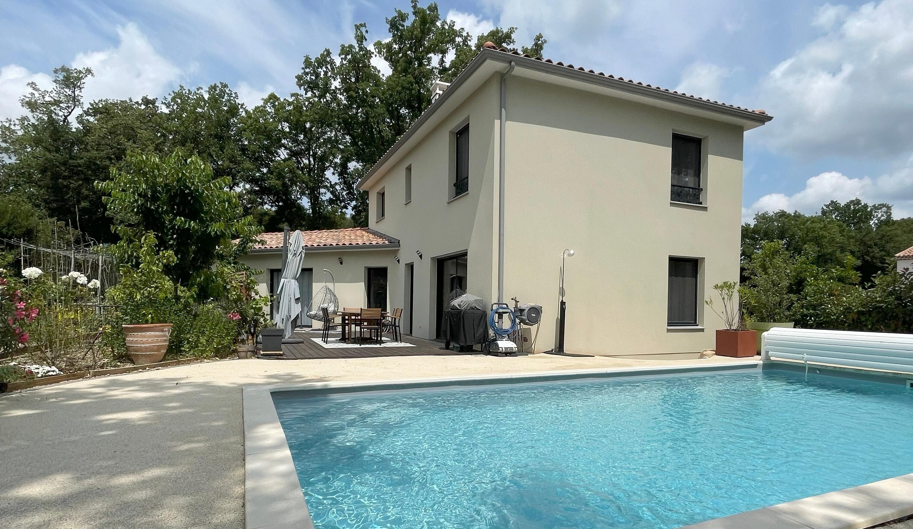 Lumière et espace sont au cœur de ce projet : de larges baies vitrées orientées Sud et Est inondent le séjour de clarté et ouvrent sur une terrasse en bambou et une piscine, créant un lien direct avec l’extérieur. L’orientation à 45° de la suite parentale de 22 m², située en rez-de-chaussée, renforce l’originalité de l’ensemble et garantit une intimité préservée. À l’étage, 4 chambres et une salle de bain complètent l'ensemble.
