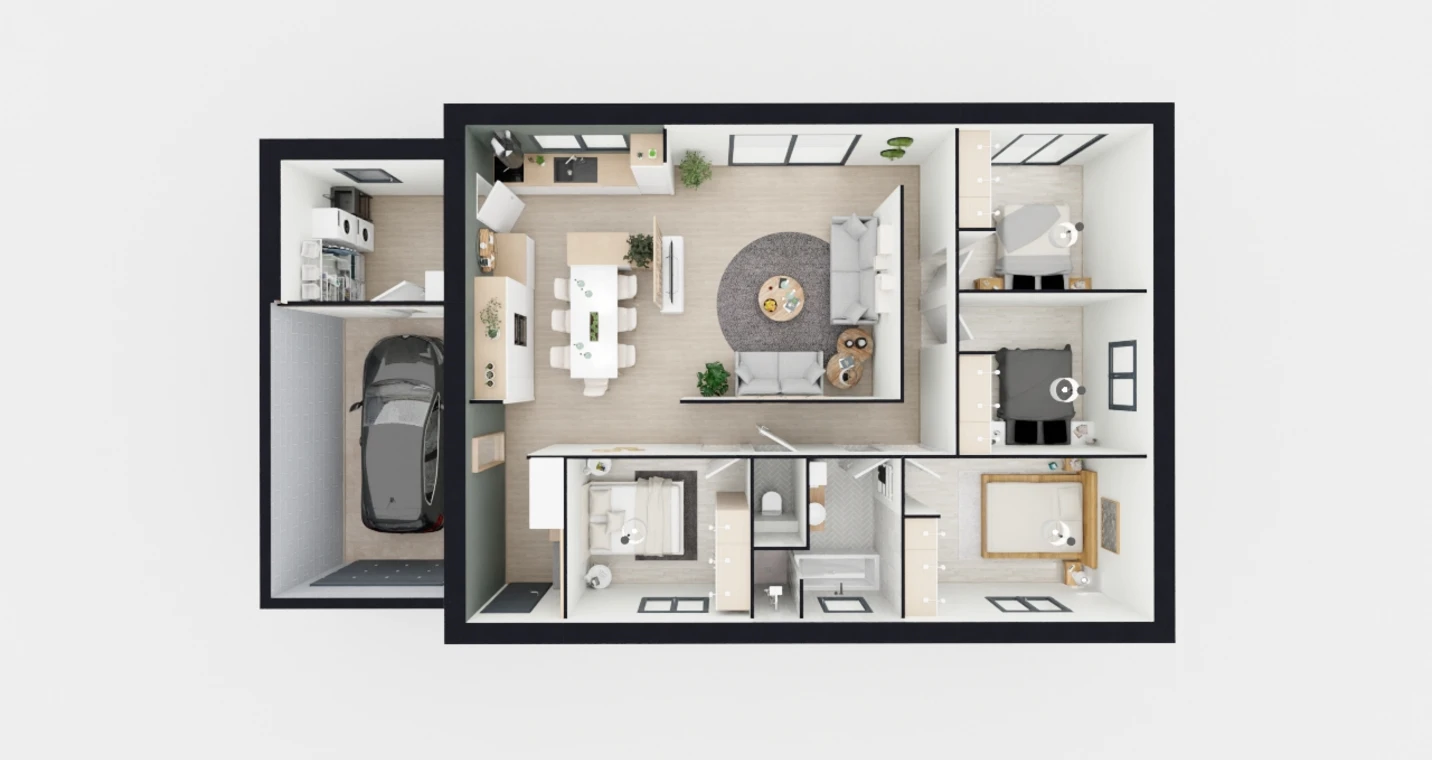 Avec quatre chambres intelligemment agencées, chacun trouve son espace personnel. L'une d'entre elles peut être transformée en bureau, salle de sport ou coin pour développer une activité indépendante, selon vos envies. La salle de bain et les WC séparés complètent ce plan idéal pour une vie de famille harmonieuse.
