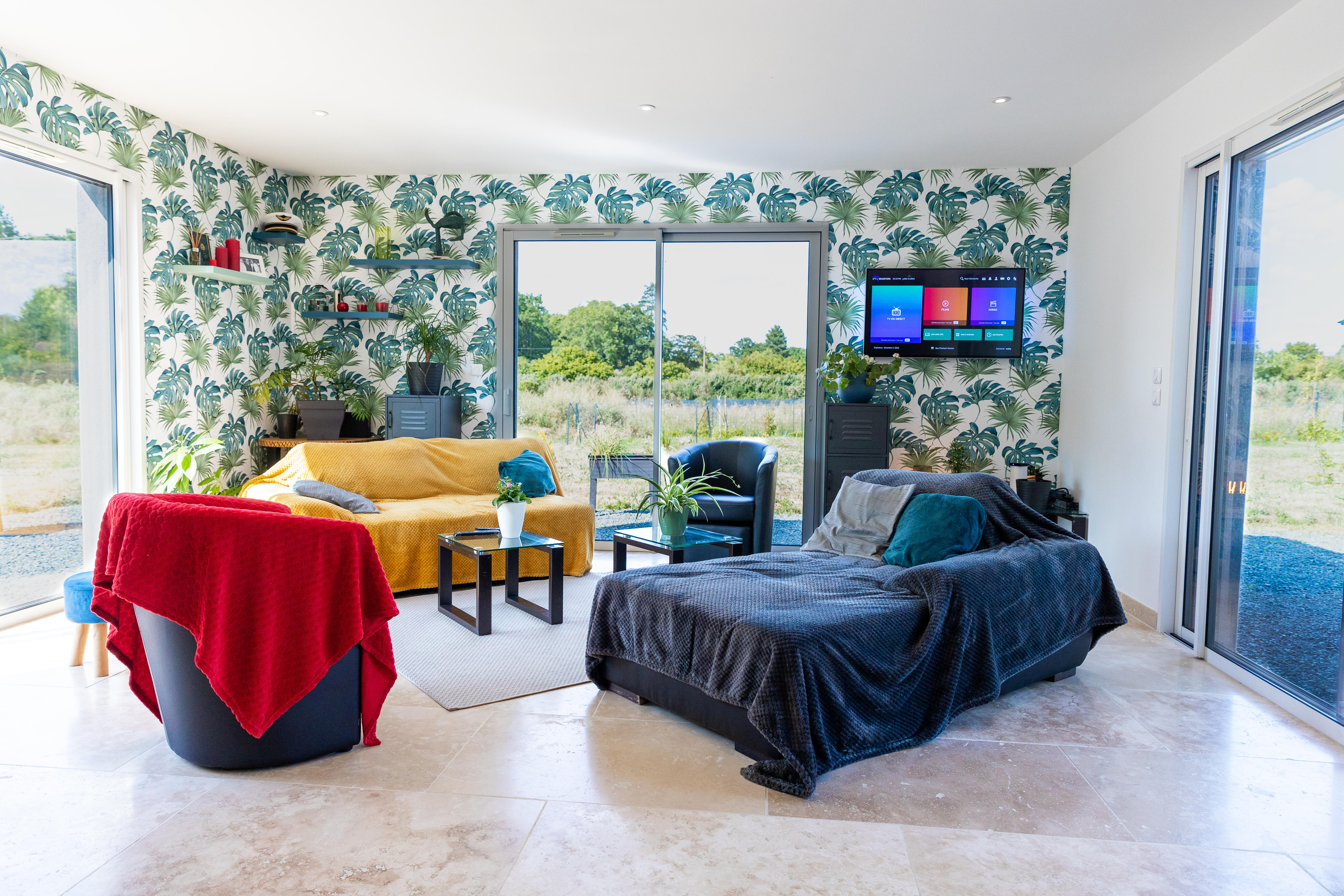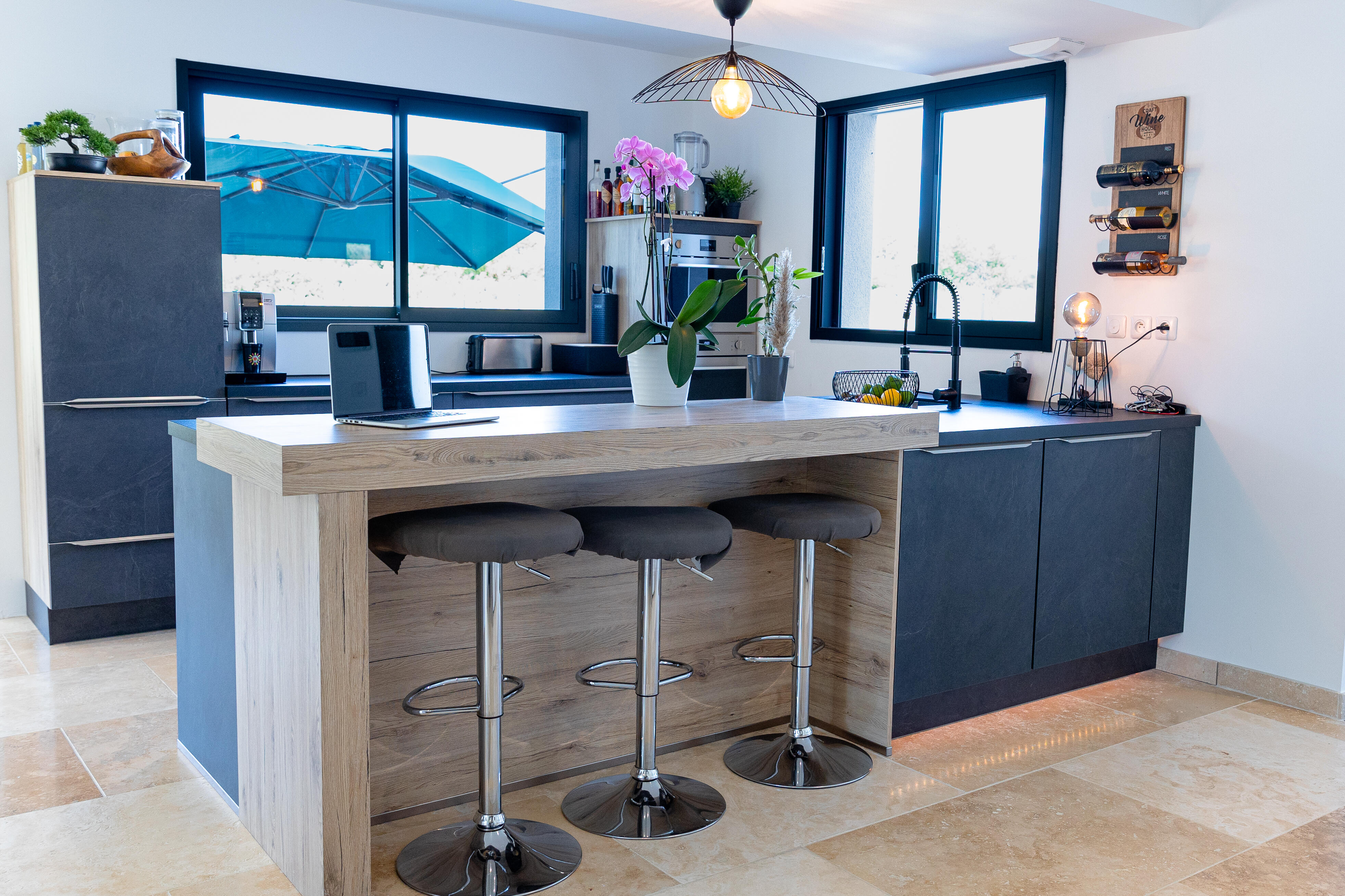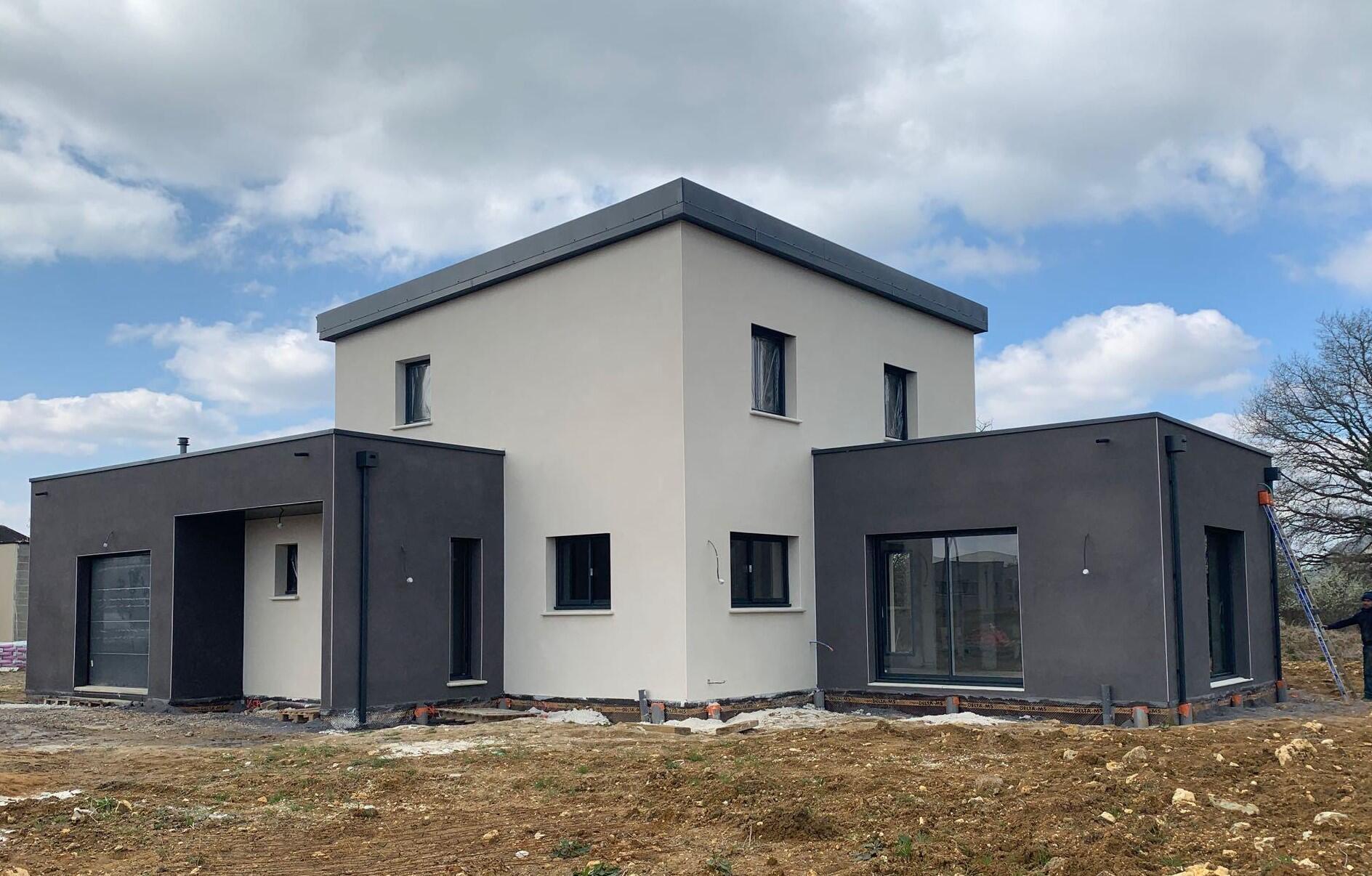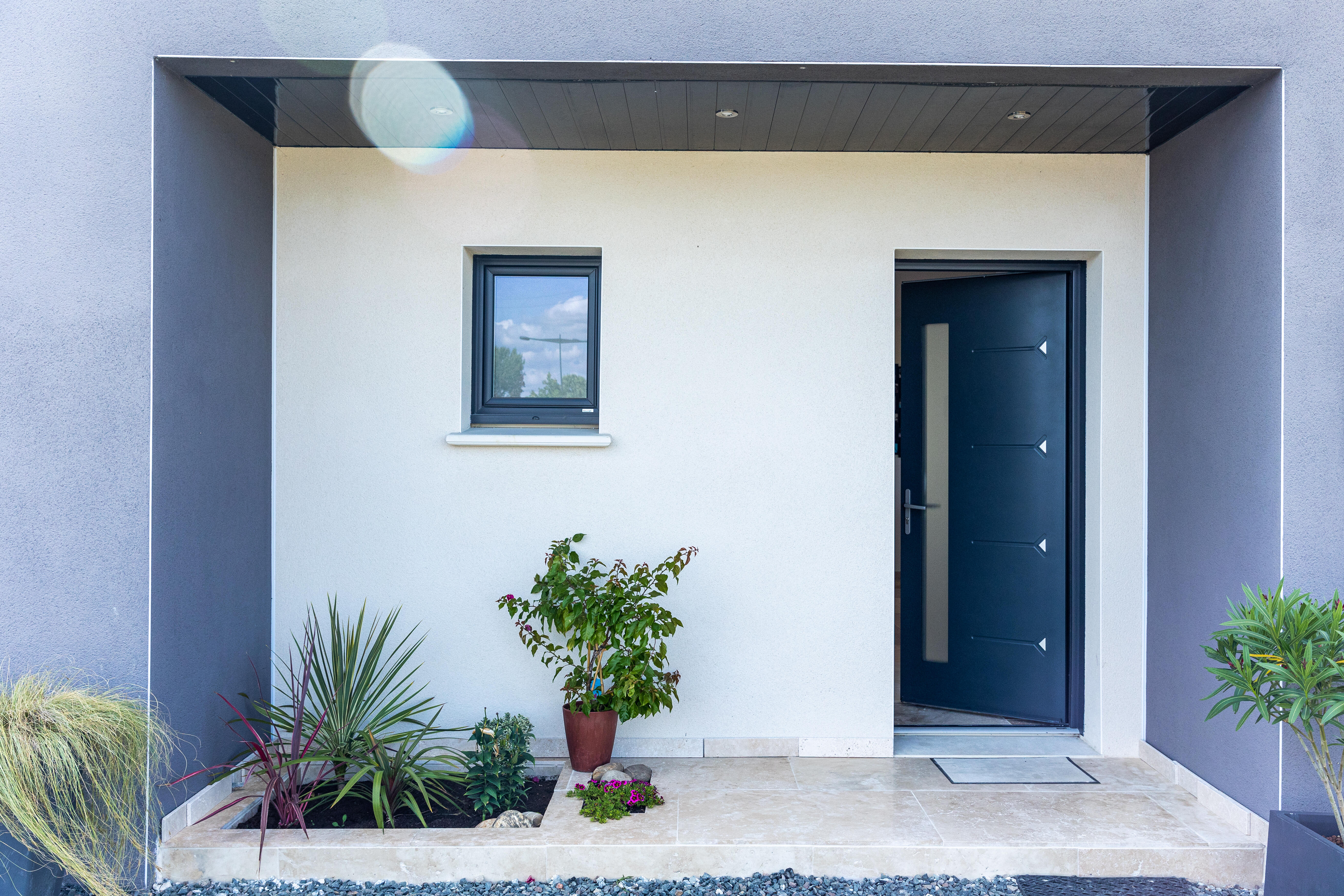 Cette maison contemporaine se distingue par une architecture moderne dotée d'un toit plat et d'un toit en bac acier. Ses menuiseries gris anthracite offrent une excellente luminosité et renforcent son style épuré.