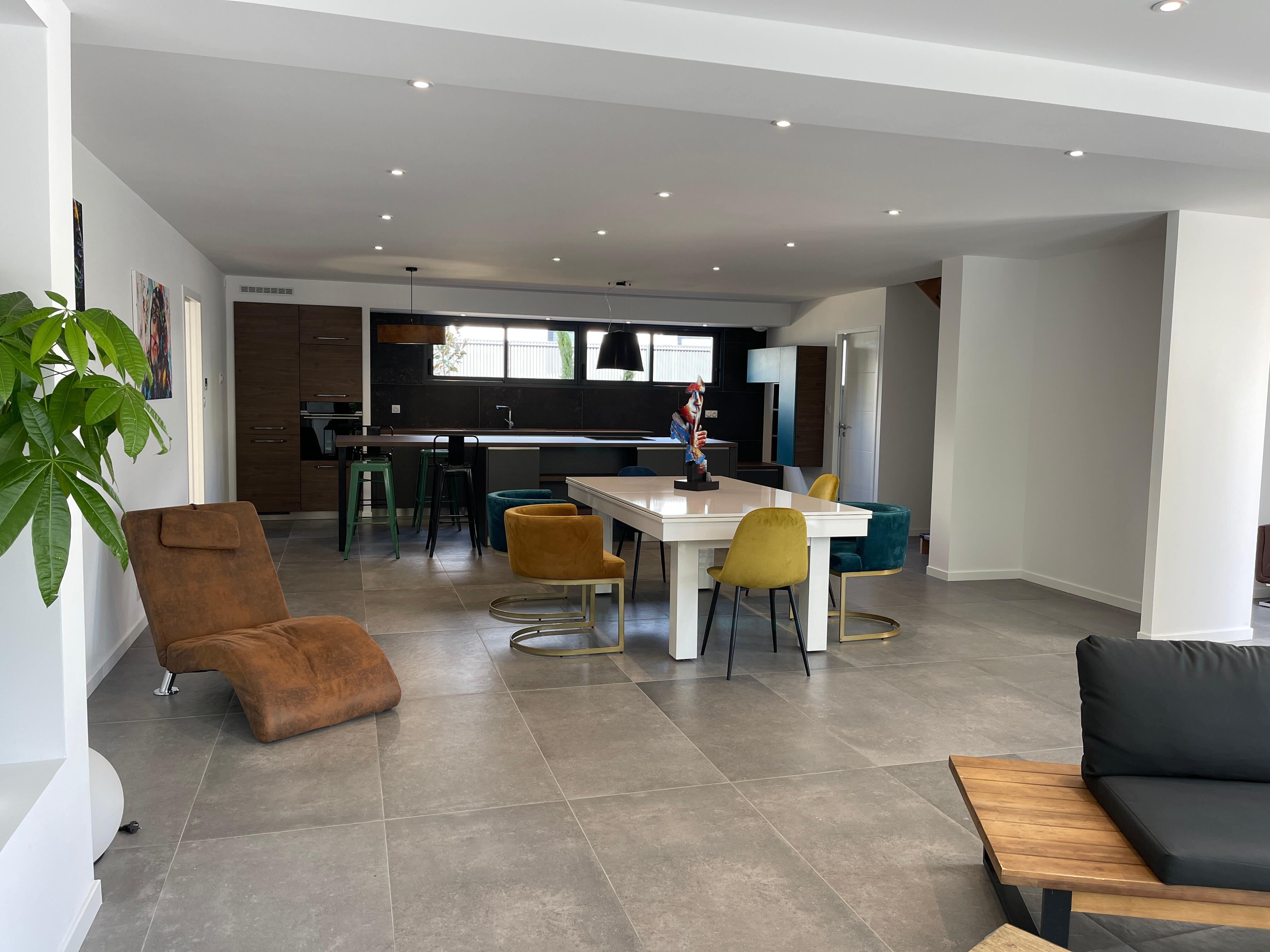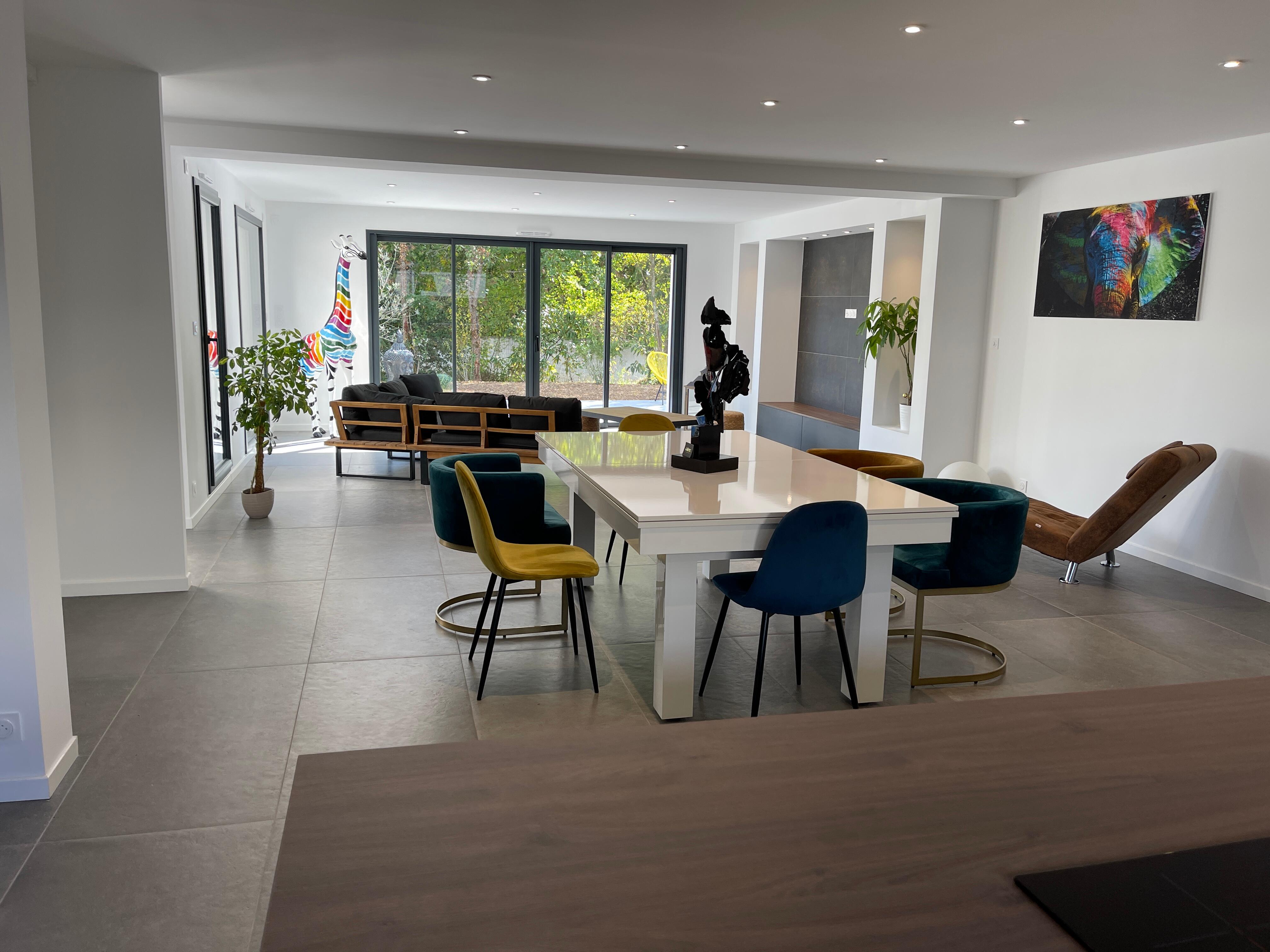 Dès l’entrée, la lumière naturelle s’invite généreusement grâce à de grandes baies vitrées qui offrent une belle ouverture sur l’extérieur. L’agencement a été conçu pour optimiser les volumes et créer des espaces de vie spacieux et fonctionnels, parfaitement adaptés aux besoins d’une vie de famille.